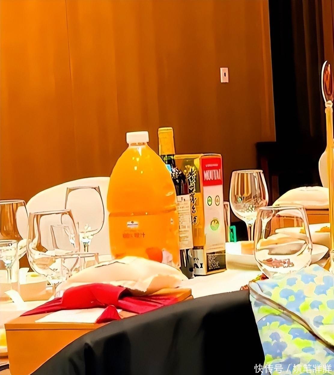 桌上陈列着茅台酒与进口红酒,菜肴包含波士顿龙虾、阳澄湖大闸蟹等高档食材。
